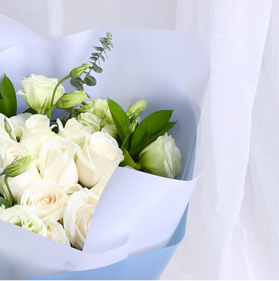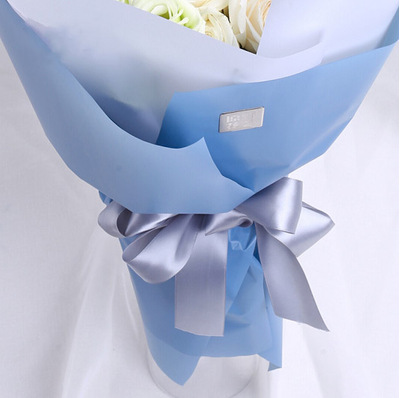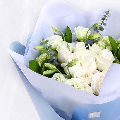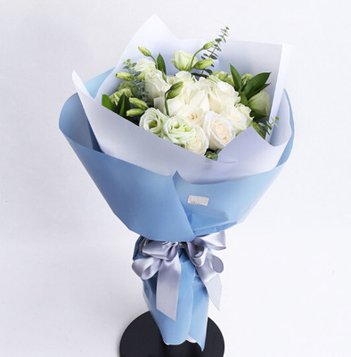 磨砂玻璃纸内衬,灰蓝色纸外围精美包装,搭配灰色丝带系蝴蝶结束扎。花语:掺杂着夕阳里淡淡的香,夹杂着水面的微凉,蓦然回首对你怦然心动。附送: