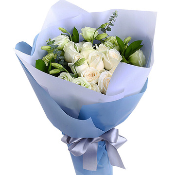 11支白玫瑰,白桔梗、尤加利叶搭配。