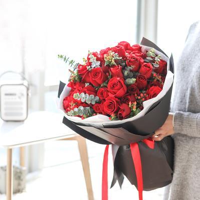 外围黑色特种纸圆形包装,内衬透明纸,红色蝴蝶结束扎。花语:我的爱永远不变。附送: