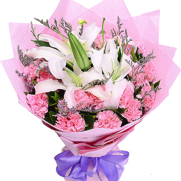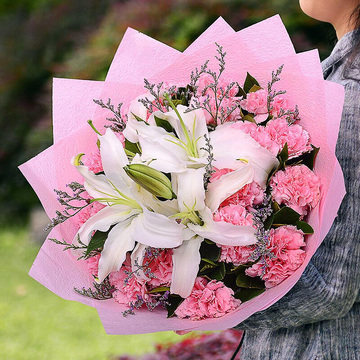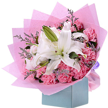 19枝粉色康乃馨,2枝多头白百合,情人草和栀子叶间插