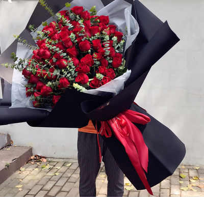内层白色雾面纸,外层高档黑色包装纸大束包装,红色缎带扎束花语:我要你知道,在这个世界上总有一个人是等着你的,不管在什么时候,不管在什么地方,反正你知道,总有这么个人。附送: