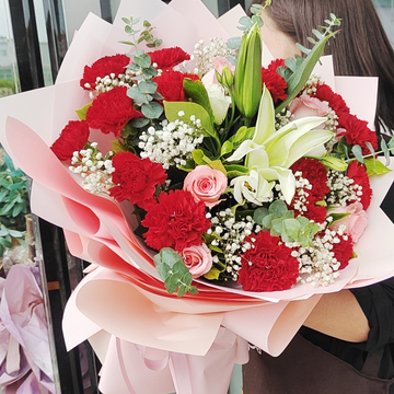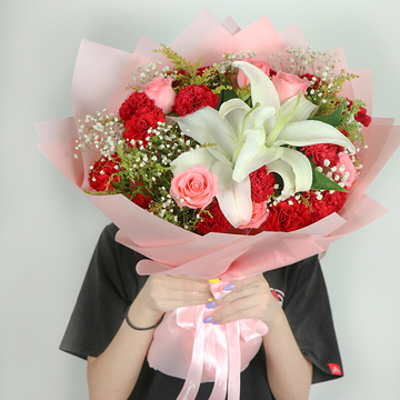 15朵红康,6朵戴安娜,1支多头白百合,白色满天星搭配,尤加利或黄莺间插