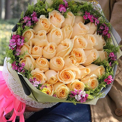 33朵香槟玫瑰,四周黄莺、相思梅间插点缀。