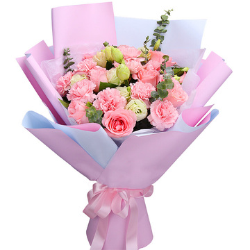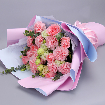 11朵粉色康乃馨,8朵戴安娜粉玫瑰,绿桔梗丰满间插,尤加利点缀