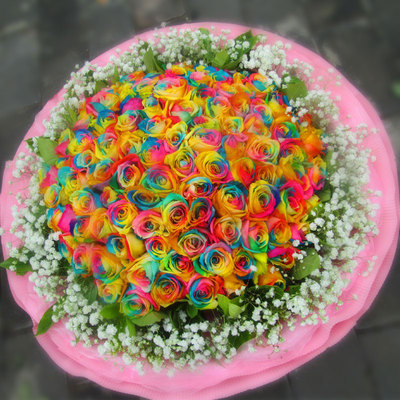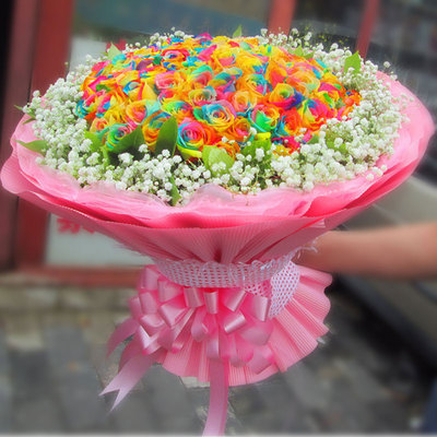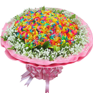99朵进口七彩玫瑰,优质满天星绿叶围绕(提前一周预定)