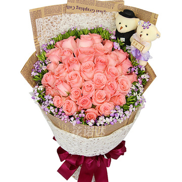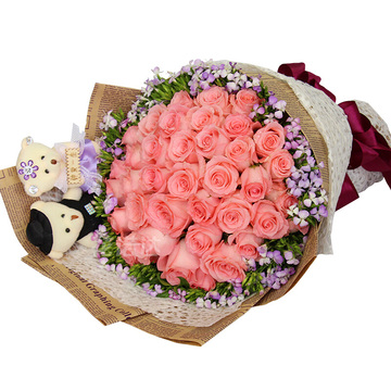 33朵戴安娜粉玫瑰,粉紫色石竹梅丰满围边,两只小熊