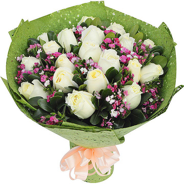 33朵白玫瑰,相思梅丰满搭配,绿叶间插