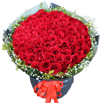 99朵红玫瑰,白色满天星丰满围边,黄莺绕边间插