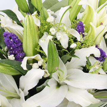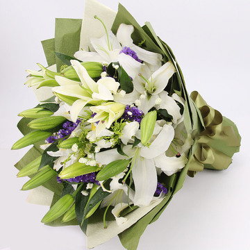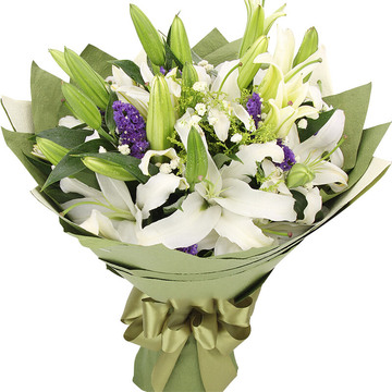 19朵白色香水百合,黄莺+勿忘我+满天星丰满搭配。