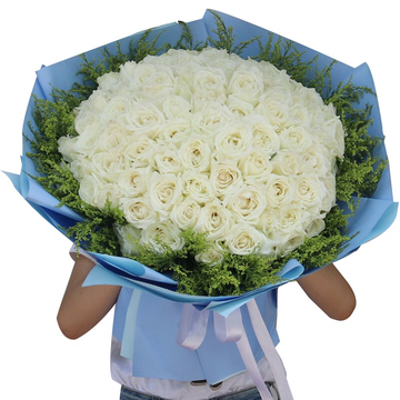 蓝色欧雅纸层次圆形包装,白色缎带束扎花语:就算世界与星空改变,爱你更多总不减半,最爱听你声线,是你轻轻叫唤我,唤醒我心中的爱火附送:
