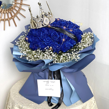 33朵蓝色妖姬,四周满天星搭配点缀。皇冠、灯带搭配