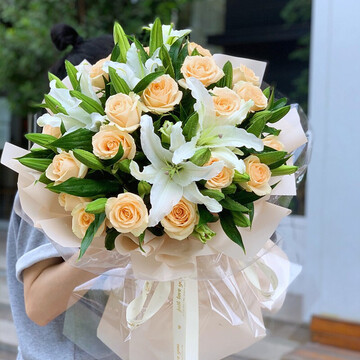 19朵香槟玫瑰,8支多头白百合