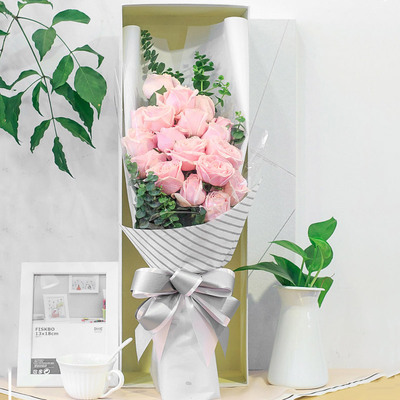 透明纸内衬,外层白色棉纸加银白条纹纸双层包装,配淡粉加银色缎带系结束扎,搭配精美礼盒包装。花语:甜蜜蜜,你笑的甜蜜蜜,好象花儿开在春风里,开在春风里。为什么你笑的这么甜蜜?因为我给你发了短信息。附送: