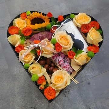 10朵香槟玫瑰,1支向日葵,红色多头玫瑰,绿叶,红薯、板栗、奶茶、糖炒山楂等搭配