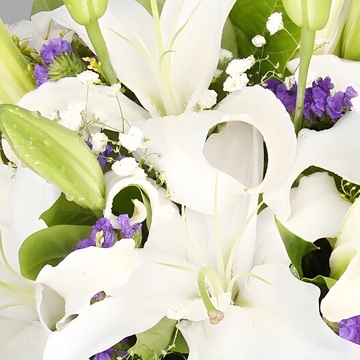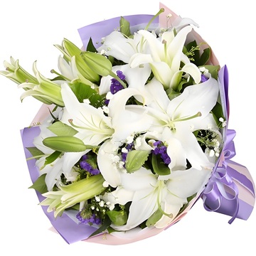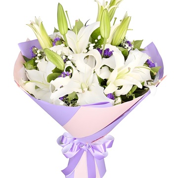 5支多头白百合,满天星、黄莺、勿忘我搭配。