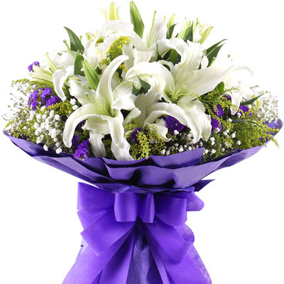 7枝多头白色香水百合,勿忘我黄莺点缀
