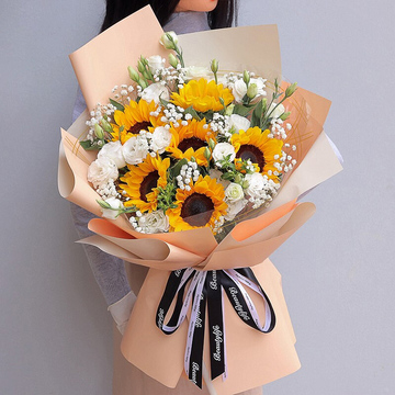 6朵向日葵,白色洋桔梗丰满搭配,白色满天星点缀