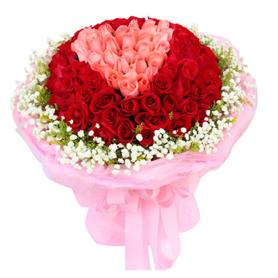 精心挑选66枝红玫瑰,33枝戴安娜粉玫瑰,外围满天星、黄莺丰满点缀。