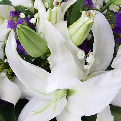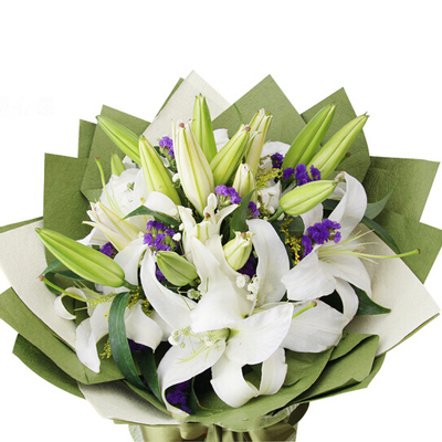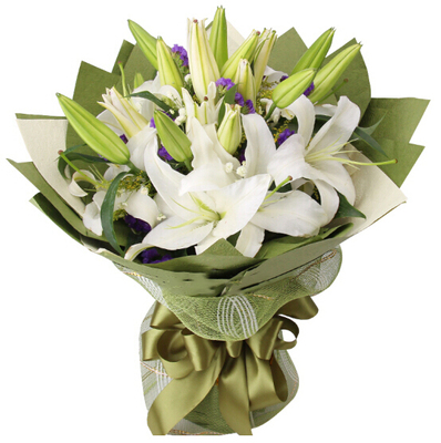 21朵白百合,满天星、黄莺、勿忘我搭配。