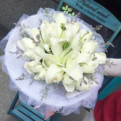 21枝白玫瑰,2枝多头白百合,情人草围边。