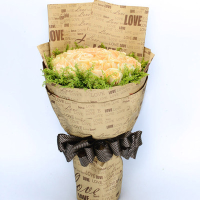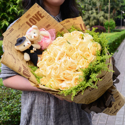 33朵香槟玫瑰,黄莺丰满点缀,随机赠送2只小熊
