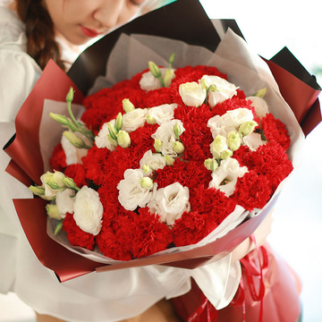 内衬雾面纸,红+黑欧雅纸包装圆形花束,红色缎带束扎花语:你的名字是我最爱的语录里唯一的单词,你的笑容是我最爱的影片里唯一的影像,你就是我我每天平凡日子里唯一的想念!附送: