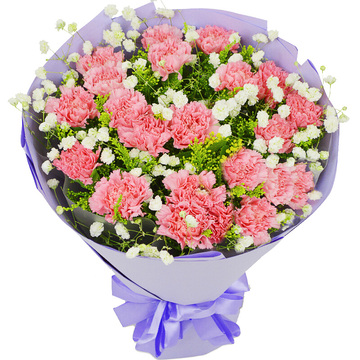 21朵粉色康乃馨,黄莺丰满,白色满天星间插点缀