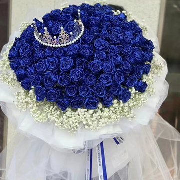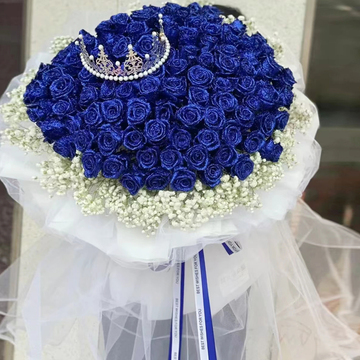 99朵蓝色妖姬,白色满天星围边,一个皇冠。