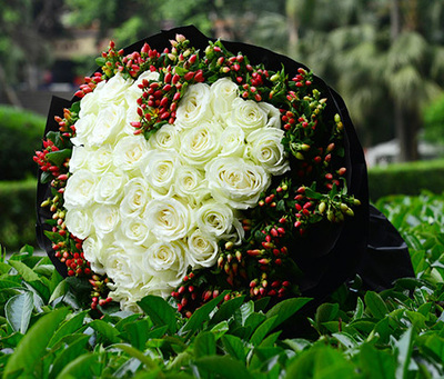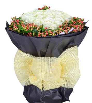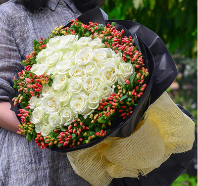 33枝优质白玫瑰,相思豆外围点缀