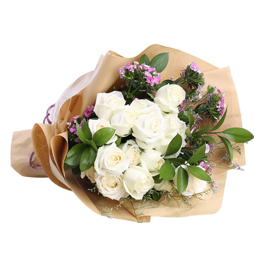 19支白玫瑰,绿叶、情人草搭配,粉色相思梅丰满点缀