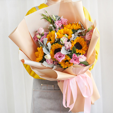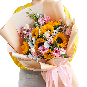 7支向日葵,粉桔梗丰满间插,搭配银叶菊和栀子叶
