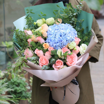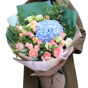14朵戴安娜粉玫瑰,6朵香槟,1朵蓝绣球,绿桔梗适量,尤加利、天门冬等配草
