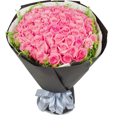 33朵戴安娜粉玫瑰,周围满天星、绿叶点缀搭配。