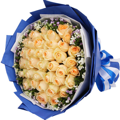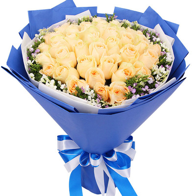 里层白色牛油纸,外层蓝色平面纸圆形包装,蓝白双色缎带束扎花语:因为是你,我知道难得,所以我才更加这段缘分附送: