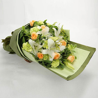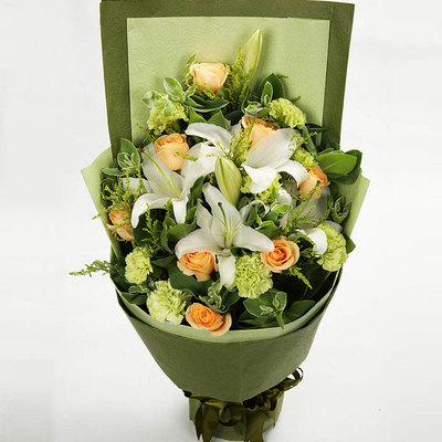 9朵绿色康乃馨、9朵香槟玫瑰、3枝百合,绿叶间插搭配。