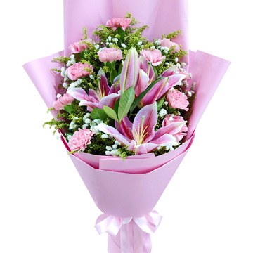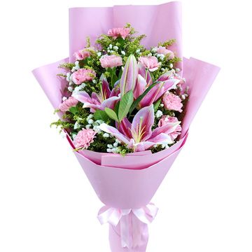 11朵粉色康乃馨,2枝多头粉百合,黄莺间插,满天星间插,栀子叶点缀