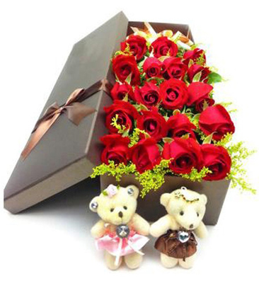 礼盒包装,送一对小熊(随机)。花语:爱的上等点。附送: