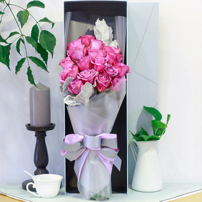 白色雾面纸包装,配银灰色加紫色双缎带系结束扎。配精美礼盒包装。花语:因为有了我的喜好而快乐,没有人可以比我更喜好你,毁伤往后,我苦苦的责骂我自己,可谁知反面湮没好多。附送: