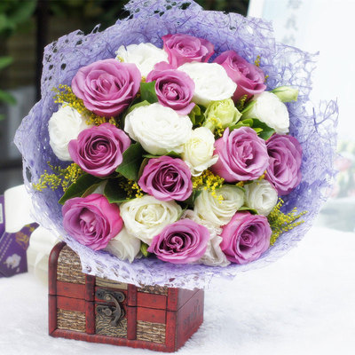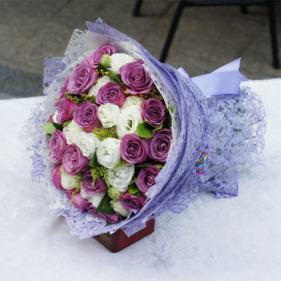 11枝紫玫瑰,10枝白玫瑰,桔梗、绿叶、黄莺点缀间插。