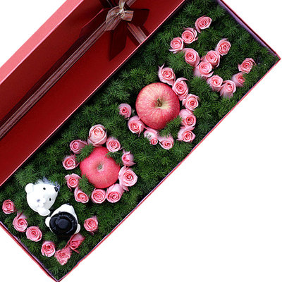 红苹果2颗、戴安娜粉玫瑰36朵、可爱小熊2只,搭配丰满天冬门装饰。
