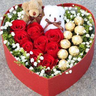 9支昆明红玫瑰,9颗巧克力,2只小熊,满天星,黄莺点缀。