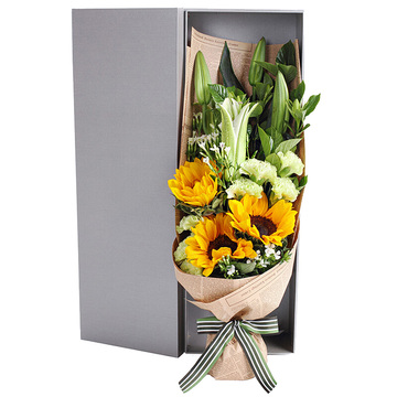 3支向日葵,2枝多头百合,7支(绿康或者绿桔梗),白色石竹梅点缀,栀子叶搭配