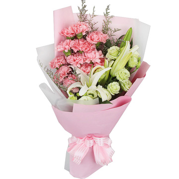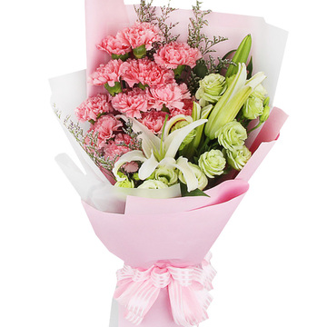 12朵粉康1枝多头白百合,3枝绿桔梗,情人草搭配