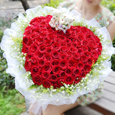 精选99支红玫瑰做成心形,黄莺、满天星围边,一对可爱小熊