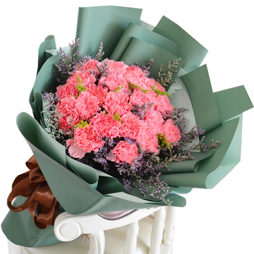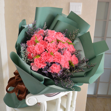 33朵粉色康乃馨,情人草(或满天星)、黄莺丰满间插