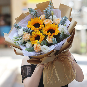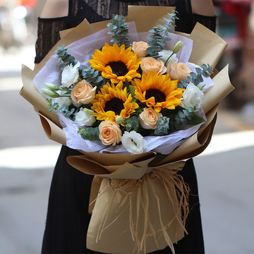 3支向日葵,6朵香槟玫瑰,白桔梗搭配,尤加利间插