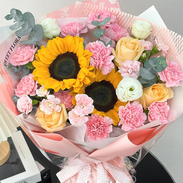 11支粉色康乃馨,2支向日葵,3支香槟玫瑰,3支粉色多丁康乃馨,白桔梗搭配,尤加利间插