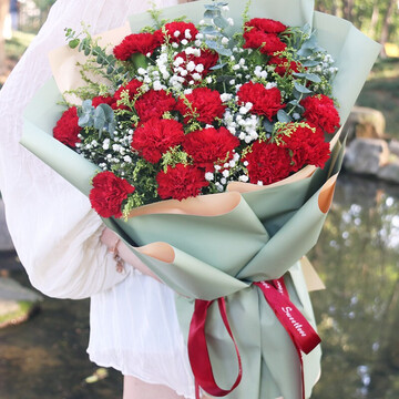 19朵红色康乃馨,满天星、尤加利、黄英搭配