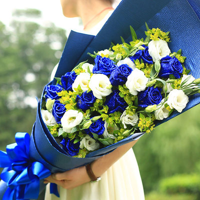 蓝色精品包装纸,蝴蝶结束扎。花语:“蓝色妖姬”相知是一种宿命,心灵的交汇让我们有诉不尽的浪漫情怀;相守是一种承诺,人世轮回中,永远铭记我们这段美丽的爱情故事!附送: