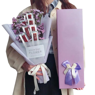 白色雾面纸+紫色韩素纸扇形包装,紫色缎带束扎,长方形礼盒装(颜色随机)花语:对你的爱就像辣条一样火辣辣附送: